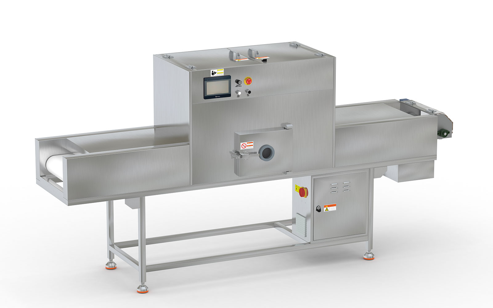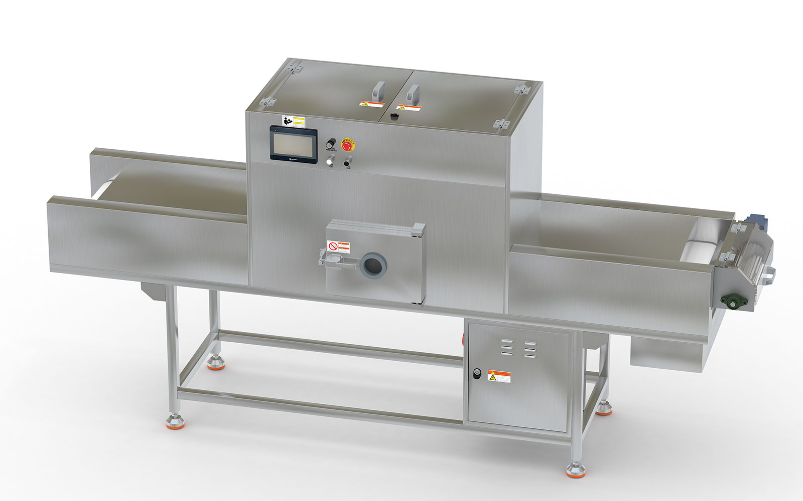3、箱體門與箱體底板為無臺(tái)階設(shè)計(jì),方便物料的清理;安裝視窗,方便觀察物料運(yùn)行狀態(tài),并設(shè)有開門自動(dòng)斷電保護(hù)裝置。